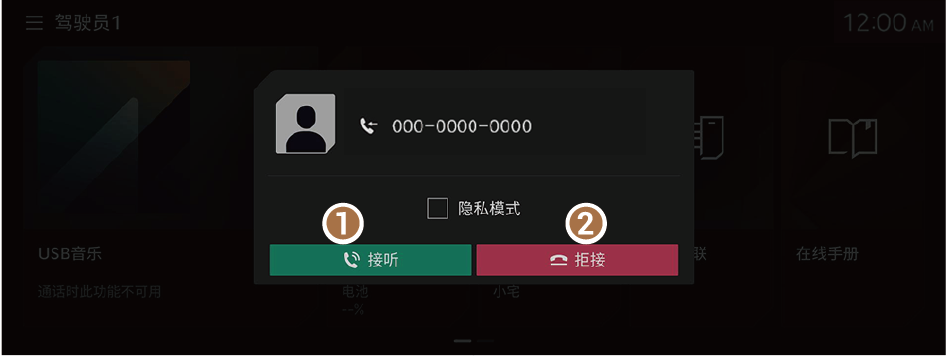 - 拒绝来电,请点击界面上的拒接 或长按方向盘上的通话按钮。