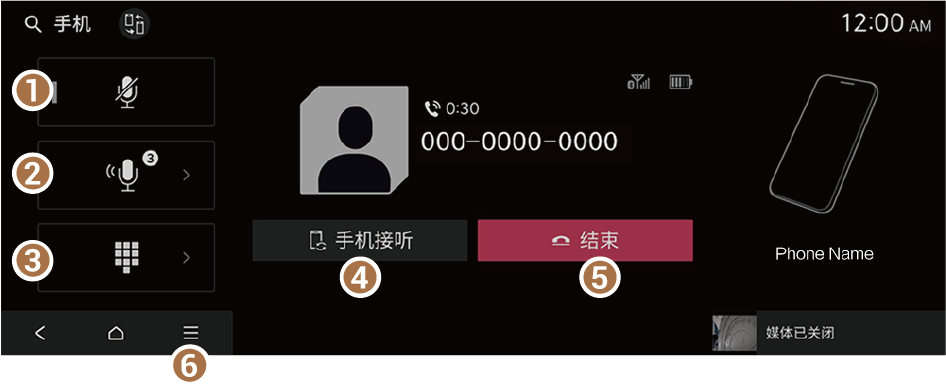 - 当手机连接到系统时,即使您离开车辆后,车辆的扬声器也可能会输出呼叫音。 如需挂断通话,请关闭系统蓝牙连接或关闭手机蓝牙功能。