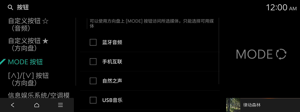 在方向盘上按下 [MODE] 键时,可选择将要运行的电台/媒体模式。