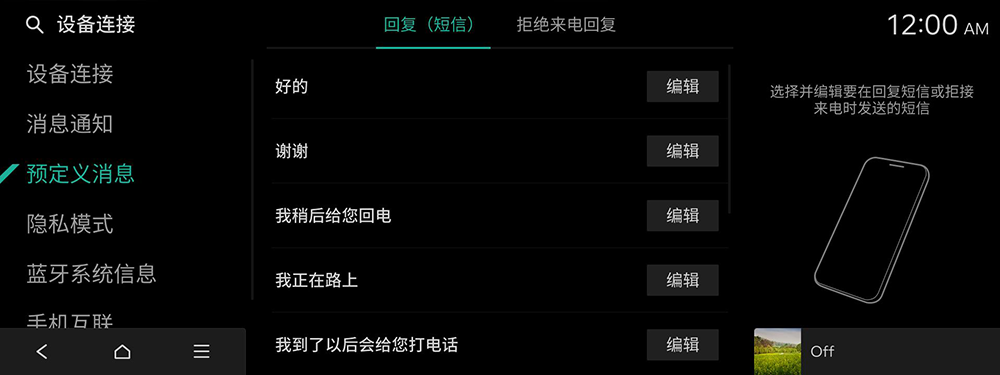 选择并编辑回复短信或拒绝来电时要发送的短信。