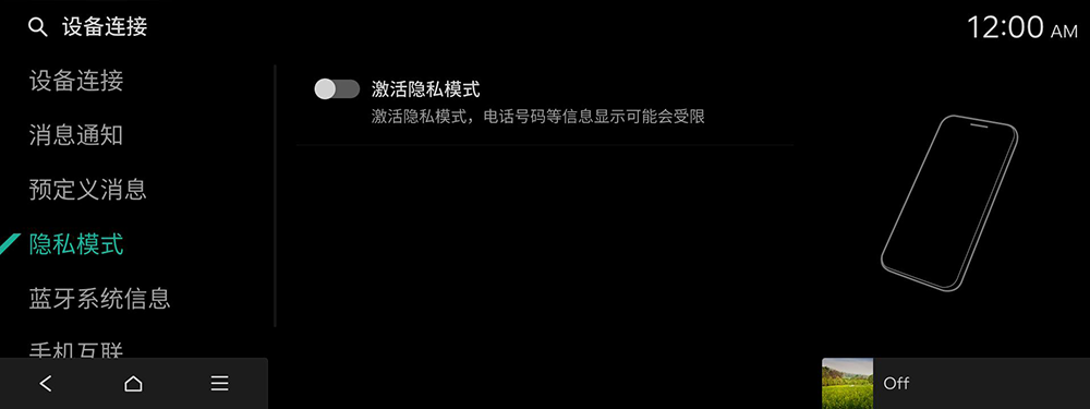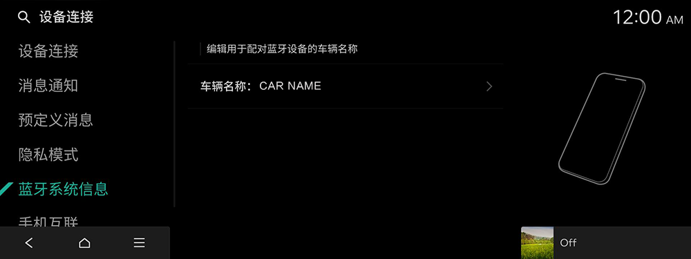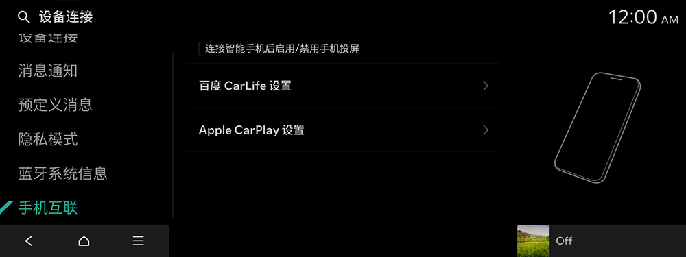 可更改与蓝牙连接有关的设置。另外,可通过连接系统和手机激活百度CarLife 功能,借此在系统画面内控制手机的应用程序。