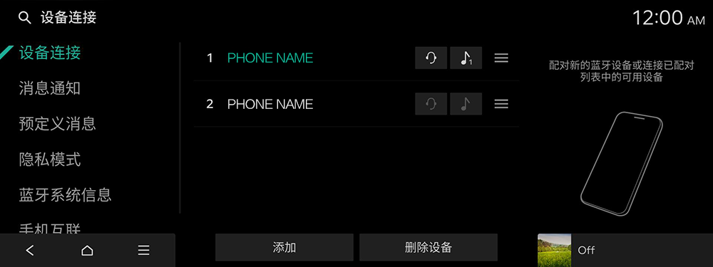 可添加新的蓝牙设备,连接设备,断开设备,亦可删除已连接设备。可对蓝牙设备的提示与短信等使用环境进行设置。