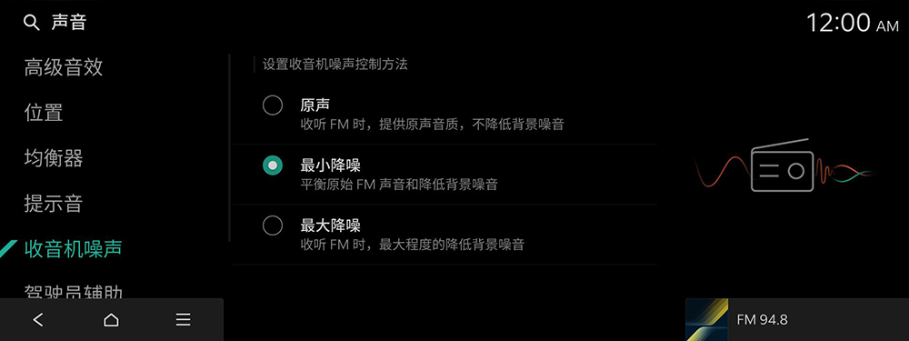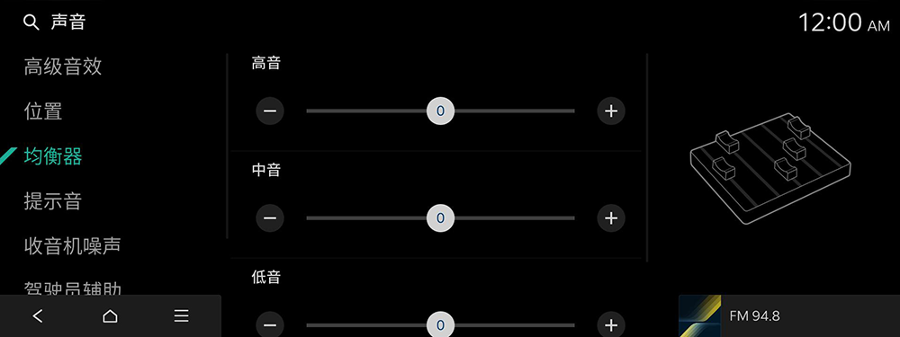 可通过调整低音、中音、高音各音域的强度(输出水平)调强或调弱相应音域的声音。另外,也可以使车辆内特定位置的声音更为明显。