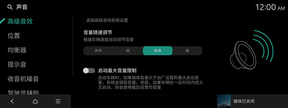 车辆启动时若音频音量高于启动默认最大值,将适当降低音量,如果车辆在熄火后立即启动,将使用最后设置的音量。