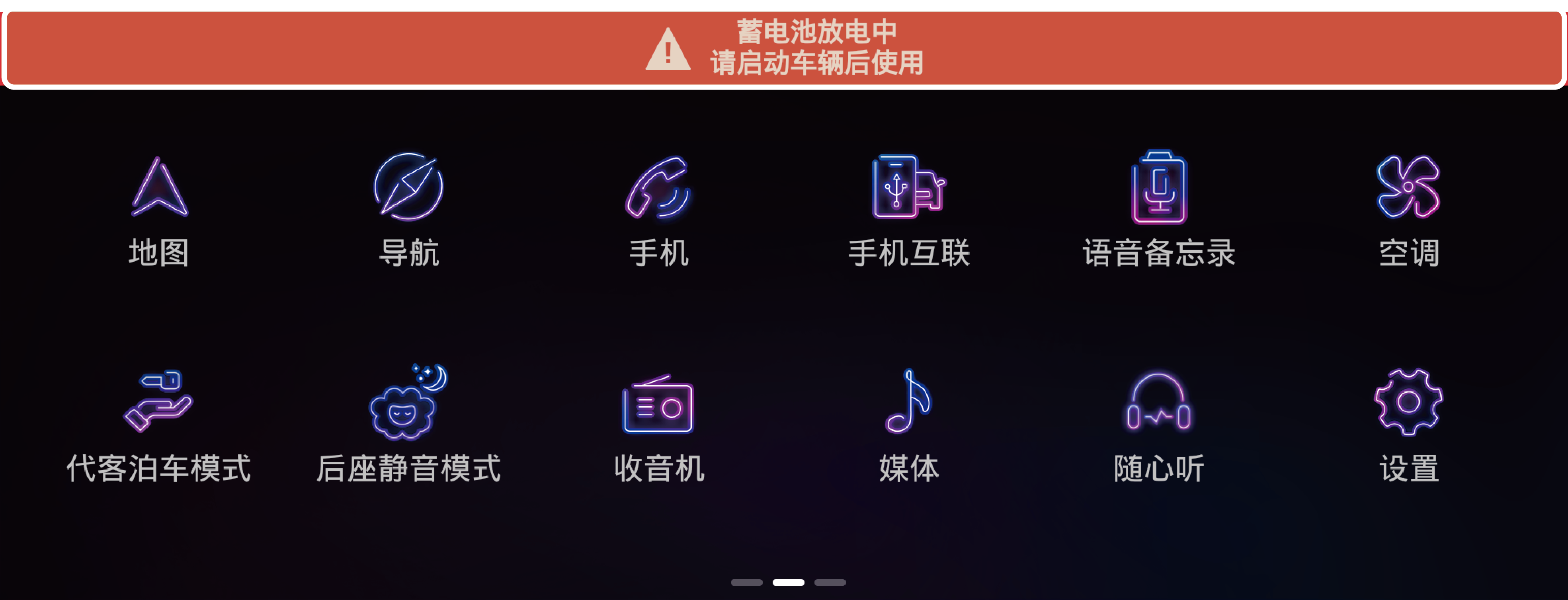 如在熄火状态下使用系统,将显示电瓶警告信息。启动车辆后,电瓶警告信息将消失。