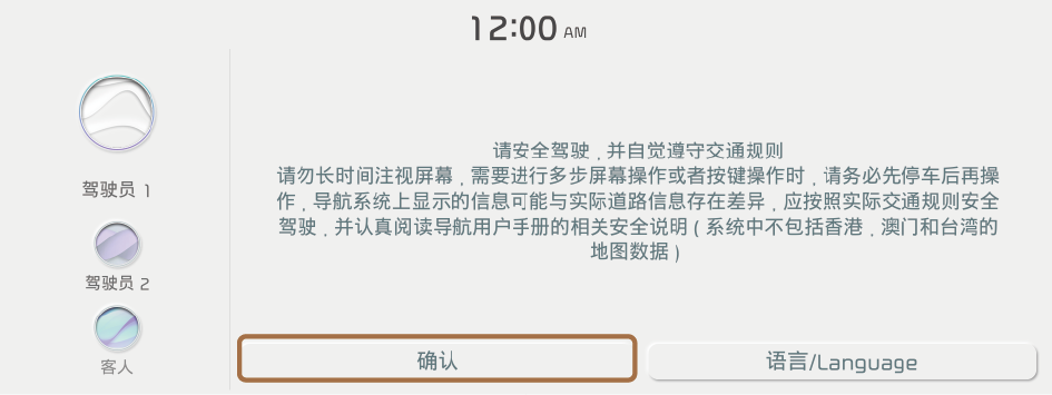 启动开关处于“ACC”或“ON”位置时也能开启系统电源,但在熄火状态下长时间使用系统时, 可能会造成电瓶过度放电。如想长时间使用系统,请启动车辆。