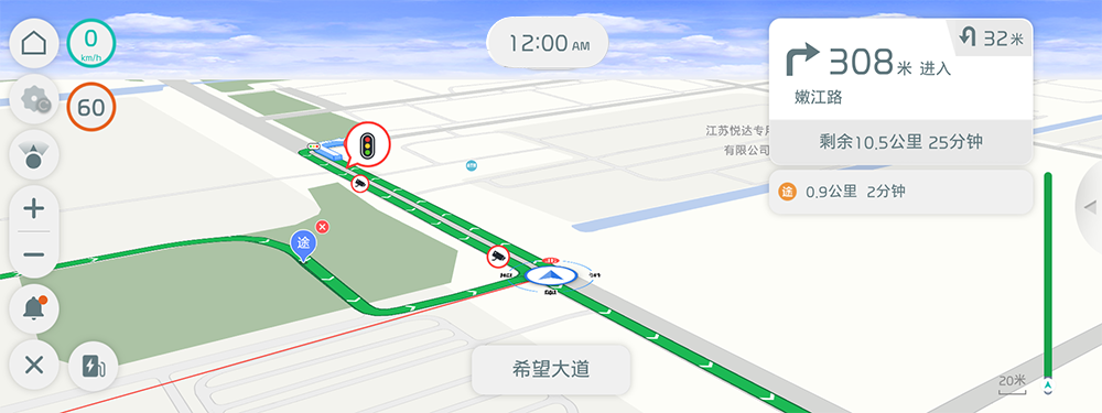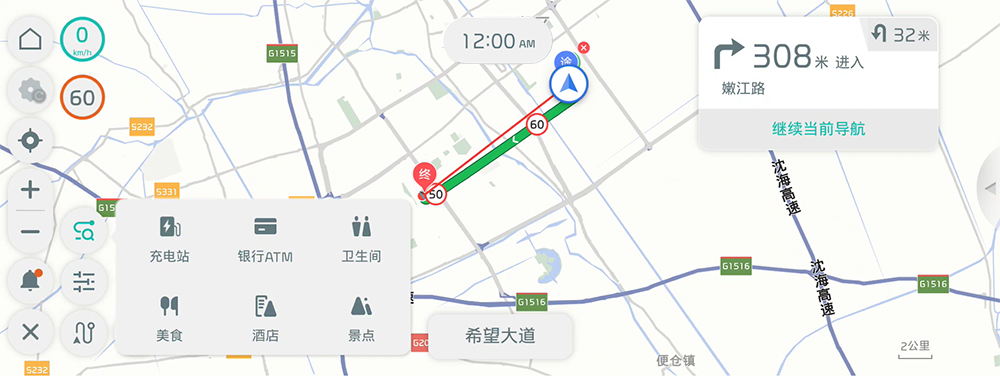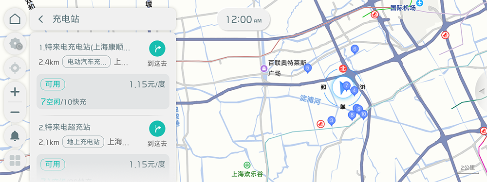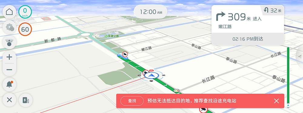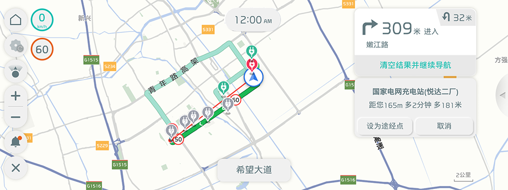 如果电池电量低且车辆无法到达航点或目的地,则可设置经过充电站的路线。