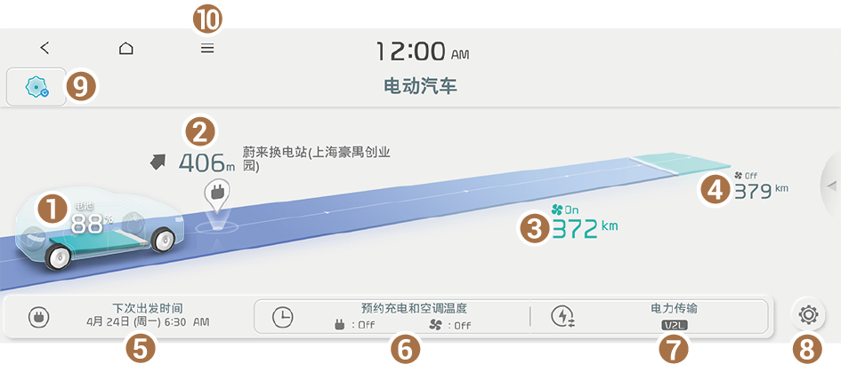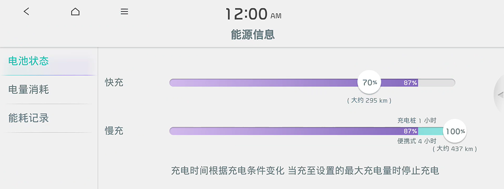 您可以查看可行驶里程、完成充电所需的预期时间、能耗相关。