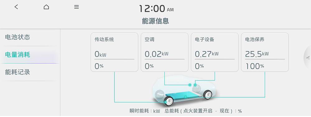 您可以查看传动系统、空调、电子设备和电池保养功能所消耗的功率。