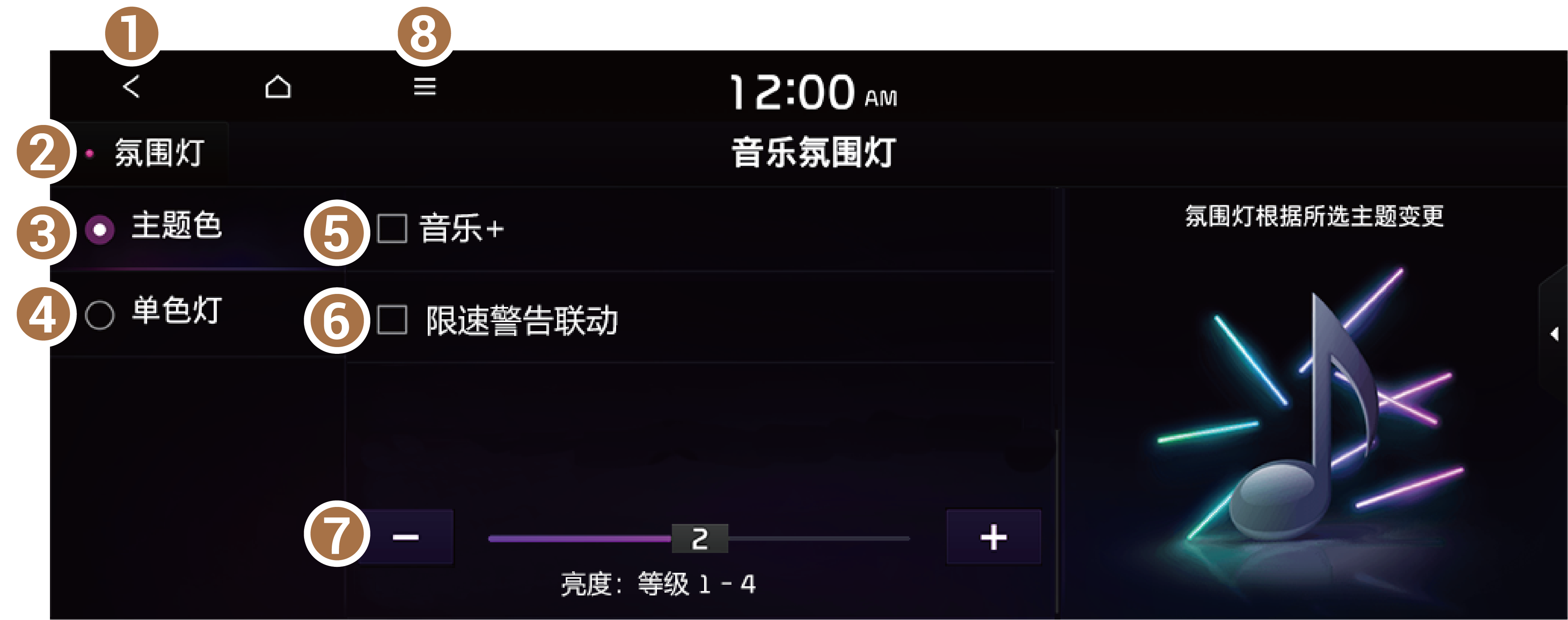 - 可设置在导航系统提供速度警报时氛围灯闪烁。