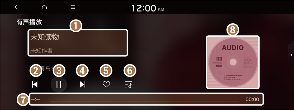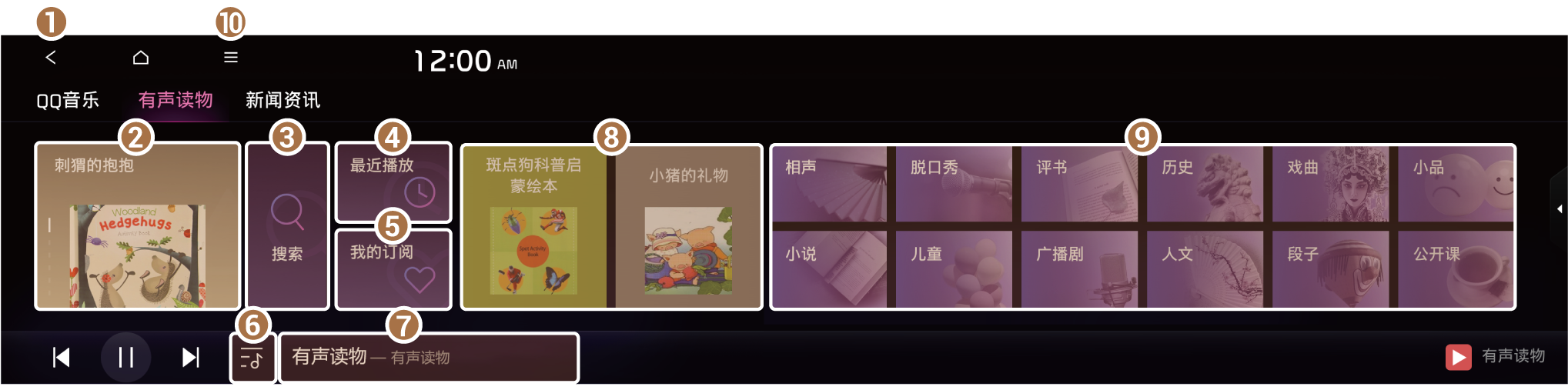 请点击 随心听 中的 有声读物或点击操作面板 键 ,在媒体窗口中点击 有声读物。