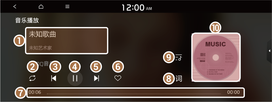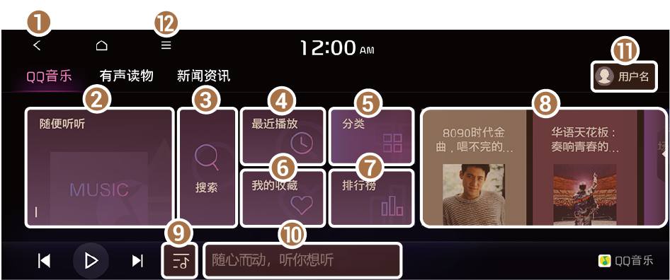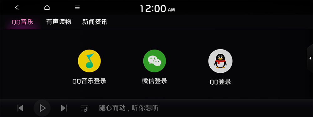 请点击 随心听 中的 QQ音乐 或点击操作面板 键 ,在媒体窗口中点击 QQ音乐。